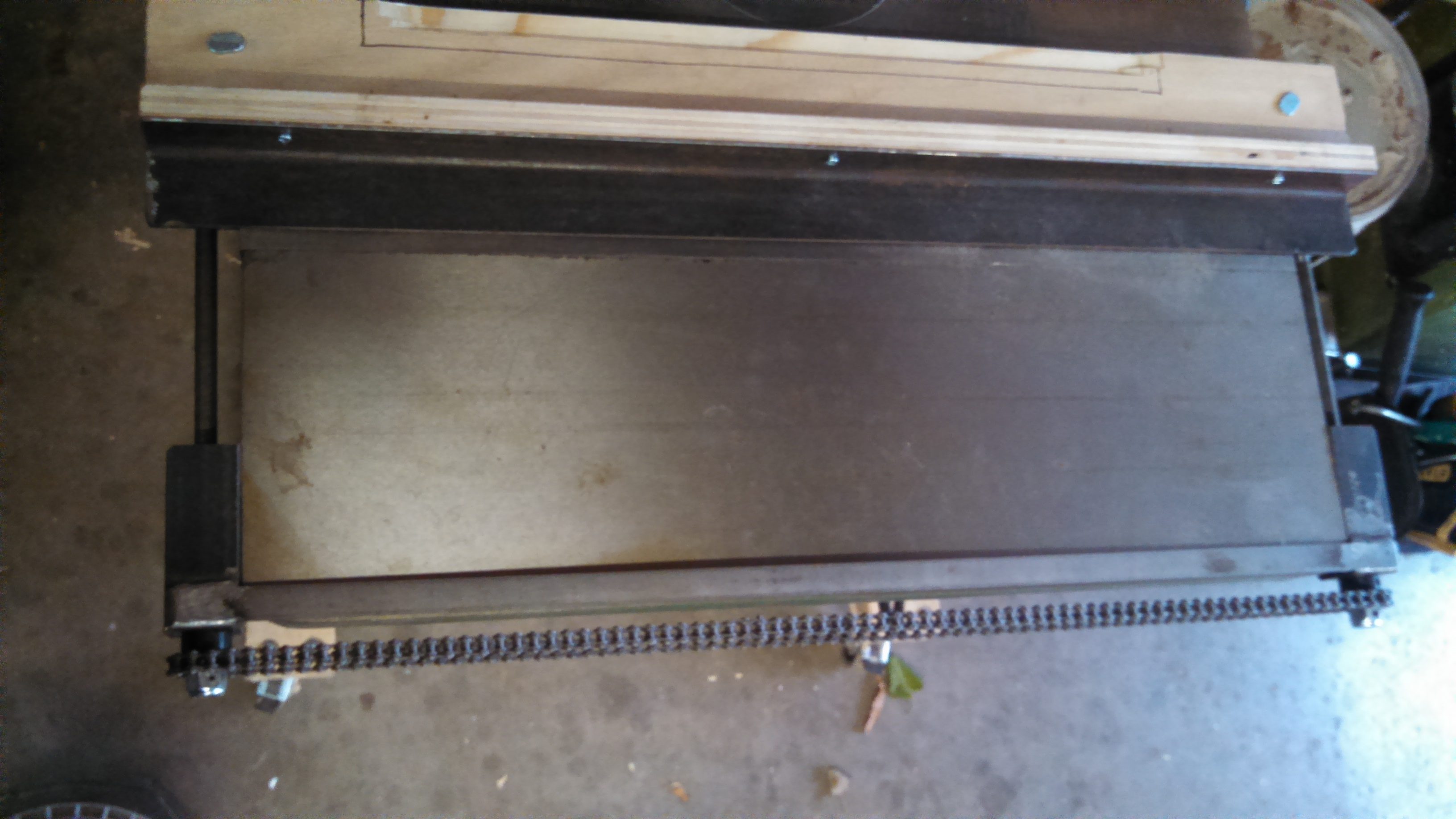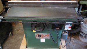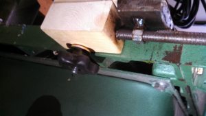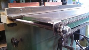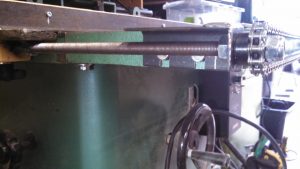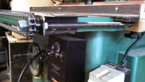 It attaches to the shaper with four tapped bolts, and it easy to remove and reinstall. It doesn’t add any thickness to the top of the table. It is built around two 1/2″-20tpi threaded rods that are synced with the chain and sprockets. The fence portion is a piece of angle iron with a replaceable wood fence, that is plowed for the feeder wheels. The fence portion also has knob clamps to snug it to the table after adjustment is made. The threaded rod being 20tpi means that adjustments to the fence position are pretty straightforward, 10 turns is .500″ 5 turns is .250″ 1 turn is .050″ 1/2 a turn is .025 etc. I use a 3/4″ wrench to make adjustments–I bought a big ass hand-wheel to use, but it was just going to be in the way, and I thought that frequency of adjustments are so low, that a wrench is just fine.
