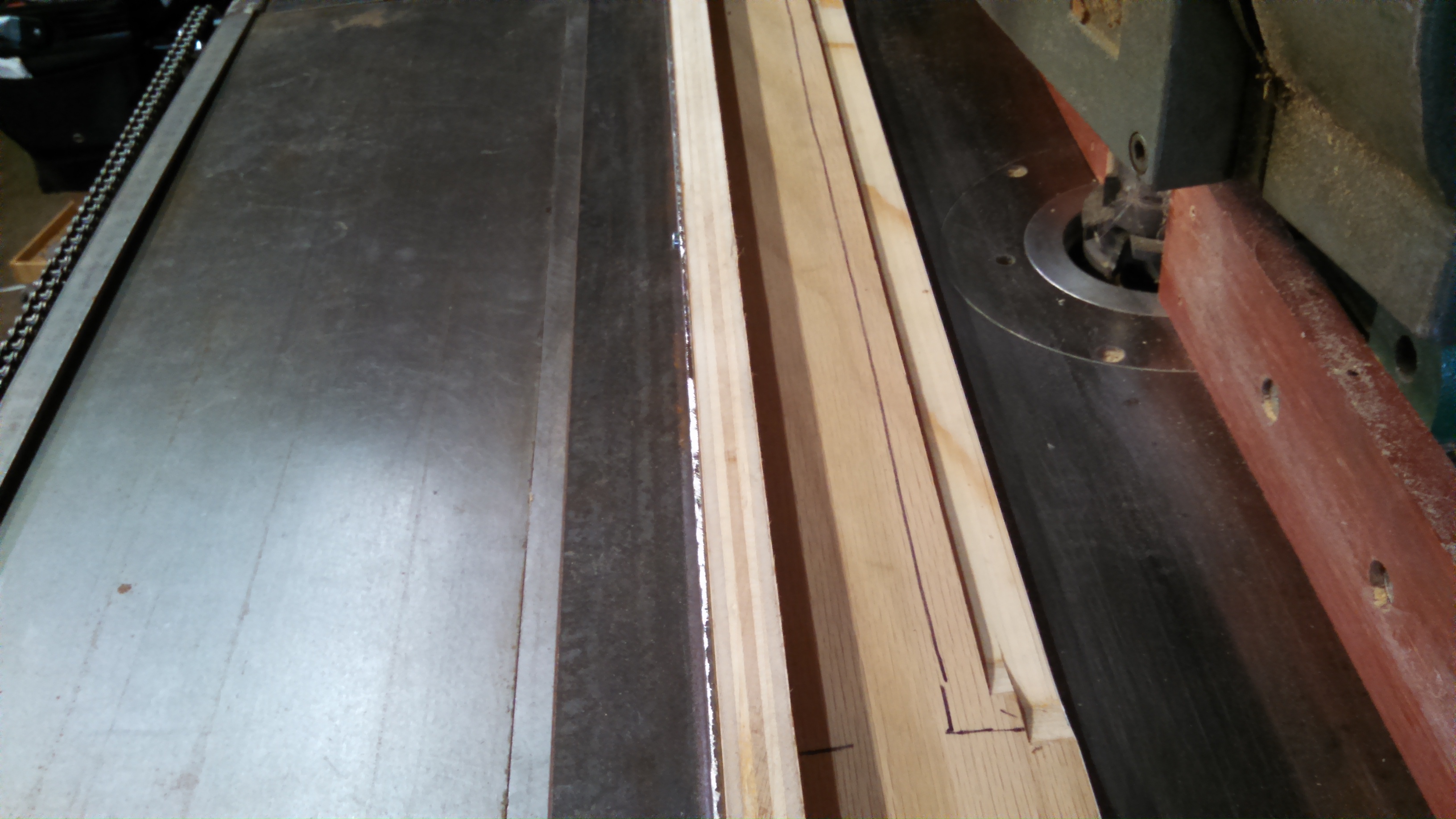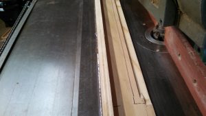 To run flooring or any other material that needs to be a consistent width after profiling the edge, the way to do it is to run it through the shaper not pressed up against the stock fence, but to attach an outboard fence set at a precise distance away from the cutter, and set up the power feeder to run the material up against that. For a while I just used a piece of wood clamped to the table, but that was awful–the process of making fine adjustments to shave off an additional .005″ was all but impossible, and was just a trial and error.