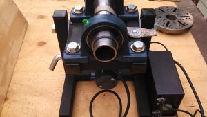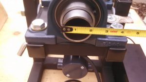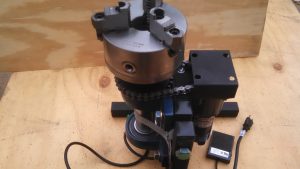 The build is as follows: 2-1/4″-8tpi spindle nose, with 1.75″ through hole. Adjustable angle from 0-90 degrees at 15 degree increments, angle plate was laser cut. 2″ pillow block bearings. 1/17hp Variable speed DC gear motor with reversing, speed is 0.5-10rpm. Frames are built out of 1-1/2″ square tube 1/8″ wall thickness. Grounding through 7/8″ flat-braided copper wire, carrying capacity about 200amps. Driven by #40 roller chain, 9 tooth on the motor, 30 tooth on the spindle.