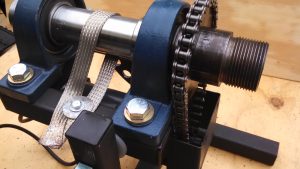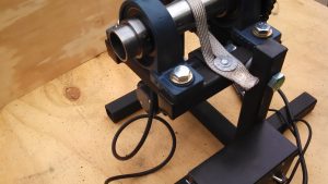 The grounding is through a strap or two of 7/8″ flat braided copper looped around the spindle,pulled tight, and bolted to the frame.